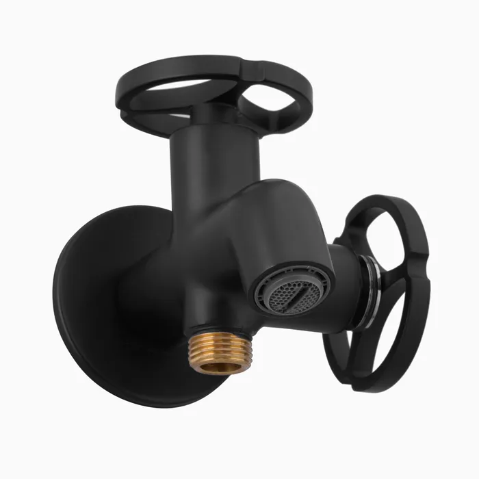 Introducing the 2 in 1 Bib Cock with Flange from the Senorita Black edition, a stylish and practical plumbing fixture designed to bring both functionality and elegance to your bathroom. With two separate controls, each controlling water flow to a different outlet, this versatile piece allows you to manage water usage for multiple fixtures, such as a health faucet and spout, from one central location. The attached flange provides a secure, stable base to ensure leak-free performance and long-lasting reliability.