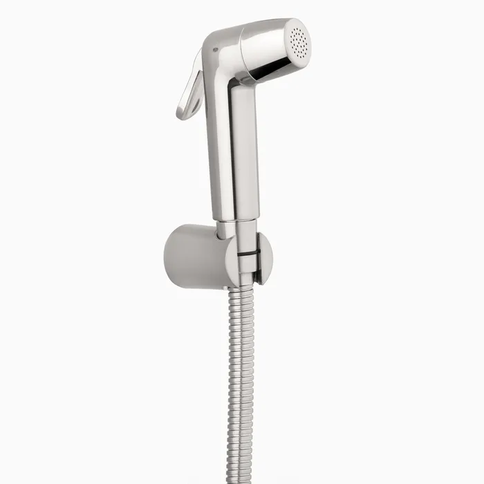 The health faucet has a chrome finish.