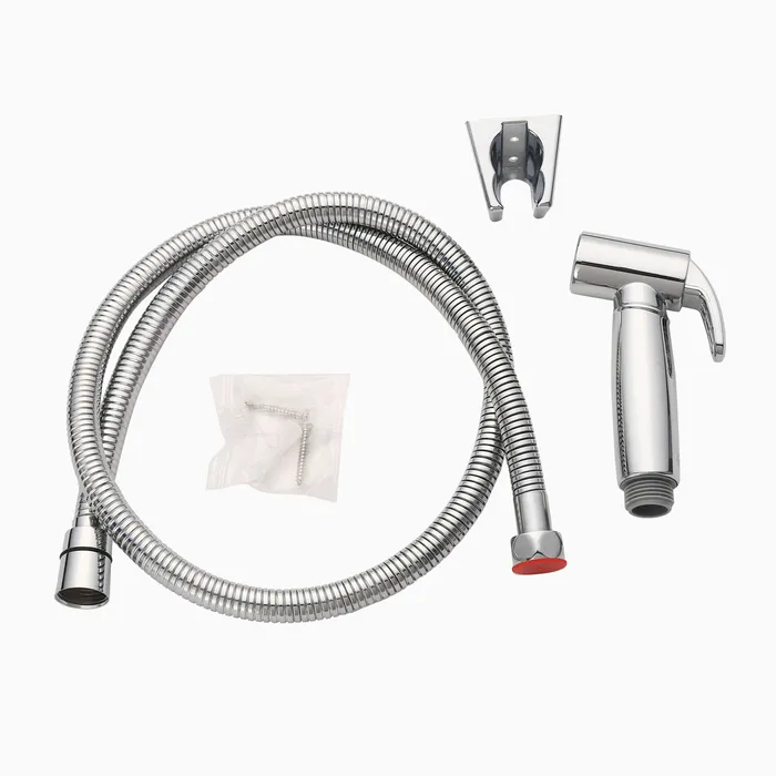 The health faucet has a chrome finish.